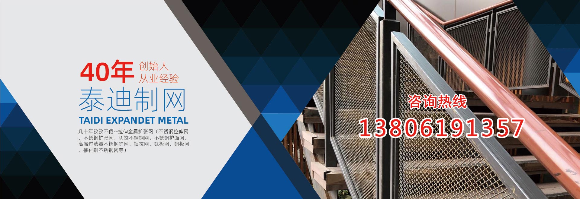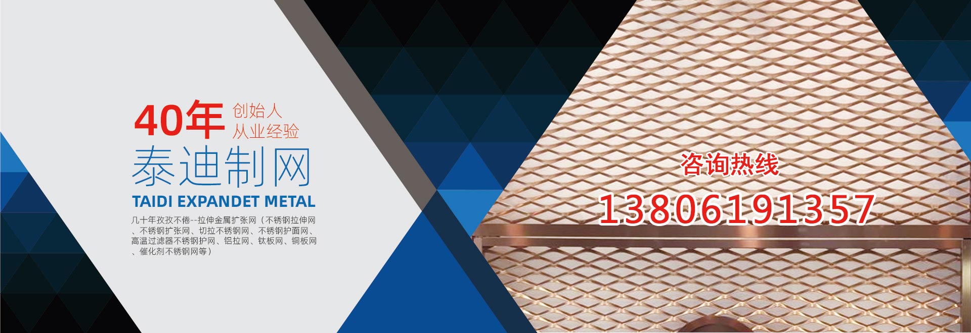 無(wú)錫泰迪環(huán)保科技有限公司,是一家專業(yè)生產(chǎn)金屬拉伸擴(kuò)張網(wǎng)的企業(yè)。公司特長(zhǎng)是:不銹鋼擴(kuò)張網(wǎng)、拉伸擴(kuò)張小孔、微孔網(wǎng)、奧氏體不銹鋼304、316網(wǎng)、超奧氏體不銹鋼網(wǎng)、鎳基不銹鋼的切拉擴(kuò)張網(wǎng)生產(chǎn)、加工。產(chǎn)品包括:不銹鋼拉伸網(wǎng)、不銹鋼擴(kuò)張網(wǎng)、切拉不銹鋼網(wǎng)、不銹鋼護(hù)面網(wǎng)、高溫過(guò)濾器不銹鋼護(hù)網(wǎng)、 板式催化劑不銹鋼網(wǎng)。復(fù)合針孔鋁板、針孔鋁拉網(wǎng)、微孔鋁板、微孔吸音鋁板、針孔吸音鋁板、微穿孔不銹鋼網(wǎng)、不銹鋼電池集流網(wǎng)、電池用不銹鋼網(wǎng)、鈦板網(wǎng)、不銹鋼板網(wǎng)、鎳板網(wǎng)、銅板網(wǎng)。鉛板網(wǎng)、超奧氏體不銹鋼板網(wǎng)、鎳基不銹鋼板網(wǎng),鋁拉網(wǎng)、鋁板拉伸網(wǎng)、拉伸屏蔽網(wǎng)、不銹鋼過(guò)濾器網(wǎng)、不銹鋼過(guò)濾網(wǎng),不銹鋼濾芯網(wǎng)、濾筒不銹鋼網(wǎng),音箱喇叭網(wǎng)罩。公司前身為13年成立的無(wú)錫泰迪金屬制品有限公司。公司創(chuàng)始人陳正芳先生從事切拉擴(kuò)張網(wǎng)專業(yè)四十年,公司產(chǎn)品在總工程師繆志明(原上海中國(guó)鋼板網(wǎng)廠工程師)指導(dǎo)下,一直保持優(yōu)良品質(zhì)。